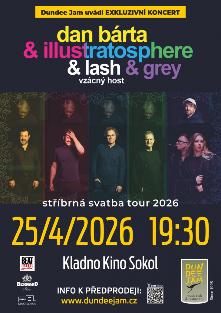 Dan Bárta & Illustratosphere & Lash & Grey: Stříbrná svatba tour Kladno – Kino Sokol / vstup do foyer od 18:30 / šatna a bary k dispozici vstupenky v předprodeji v Dundee Jamu + online smsticket informace k předprodeji na www.dundeejam.cz Jedinečný koncert Dana Bárty & Illustratosphere, jedenáctinásobného držitele Ceny Anděl v kategoriích Zpěvák roku a Zpěvák čtvrtstoletí, u příležitosti 25. výročí od vydání debutového eponymního alba! V rámci turné s názvem Stříbrná svatba bude standardní sestava skupiny Illustratosphere speciálně rozšířena o duo Lash & Grey se zpěvačkou Kristínou Mihaľovou, vycházející hvězdy na domácí a slovenské hudební scéně. Můžete se těšit na průřez toho nejlepšího z tvorby Dana Bárty & Illustratosphere a písní Lash & Grey!