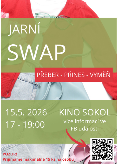Letní swap ve foayer Kina Sokol. Vstupné 80Kč. Přinést můžete max.15 hezkých věcí na osobu, odnést si můžete neomezené množství.