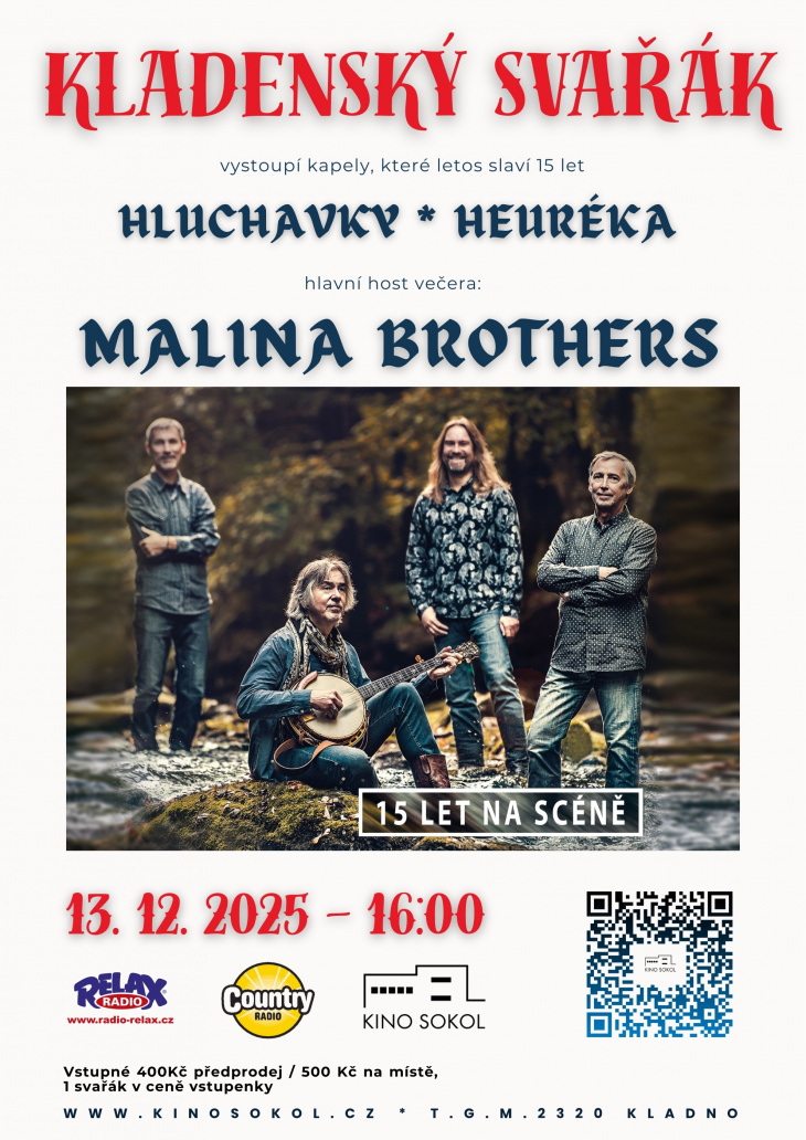 Zveme Vás na již pátý ročník folkového festivalu v adventním čase „KLADENSKÝ SVAŘÁK“. Letošní ročník bude výjimečný tím, že společně oslavíme 15.narozeniny všech vystupujících kapel. Můžete se těšit na Hluchavky a Heuréku, a na hlavního hosta festivalu – MALINA BROTHERS.